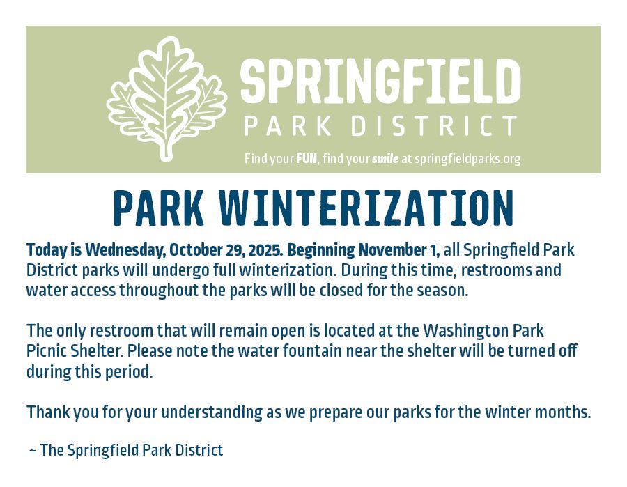Park Winterization Beginning November 1, all Springfield Park District parks will undergo full winterization. Read more about Park Winterization