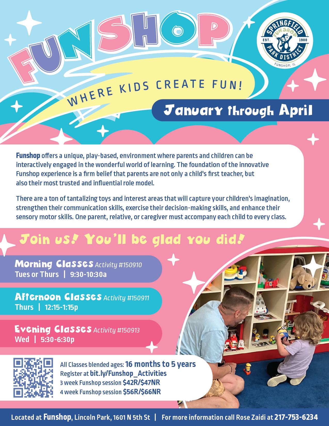 Jan06 Apr 30 Funshop: Where Kids Create FUN! Looking for a playful way to learn with your little one? Funshop is a hands-on, play-based program where parents and children learn together! Read more about Funshop: Where Kids Create FUN! on 1/6/2026 to 4/30/2026
