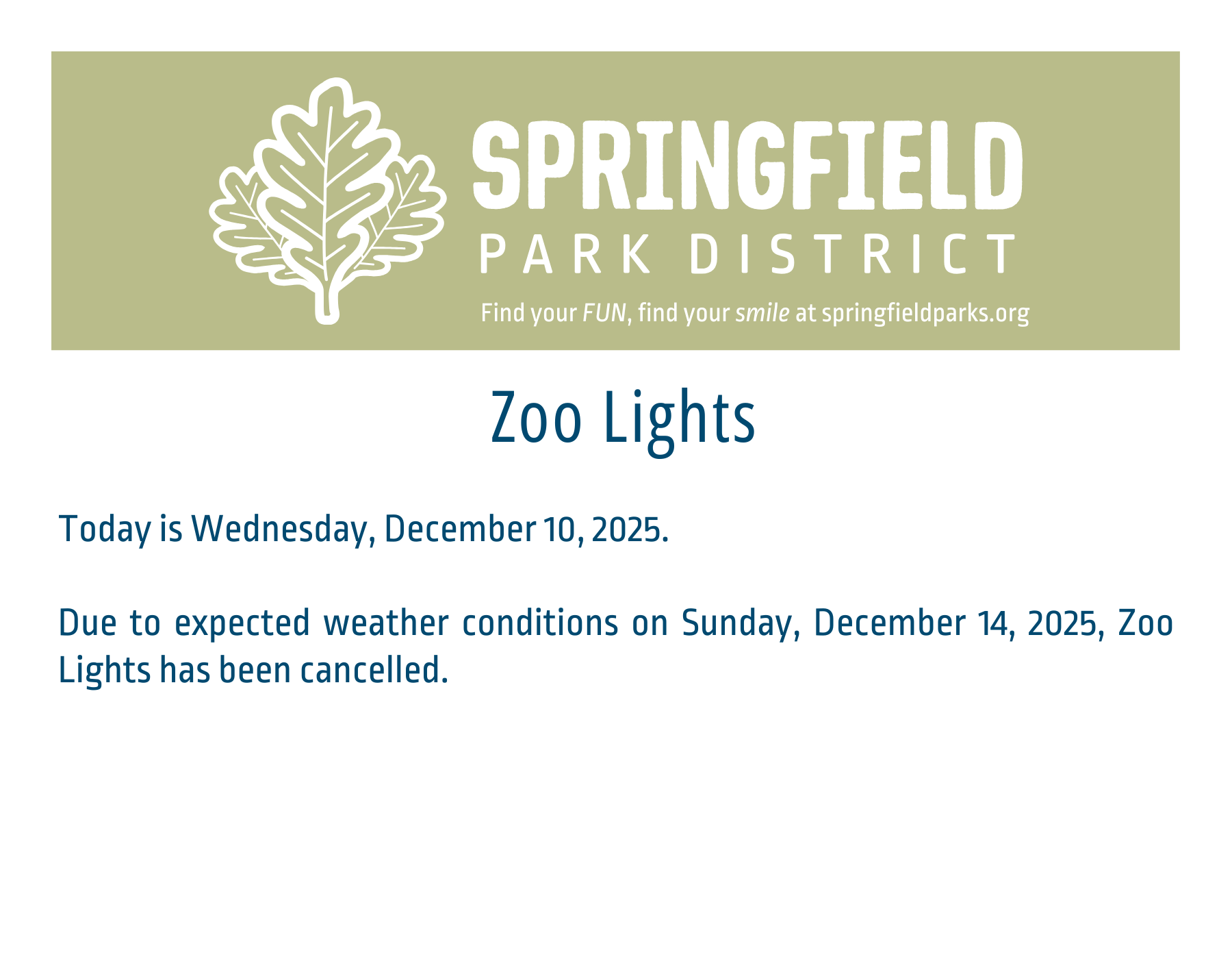 Zoo Lights Cancellation Notice Today is Saturday, December 13, 2025. Due to weather conditions today, Zoo Lights has been cancelled. Stay safe and warm! Read more about Zoo Lights Cancellation Notice