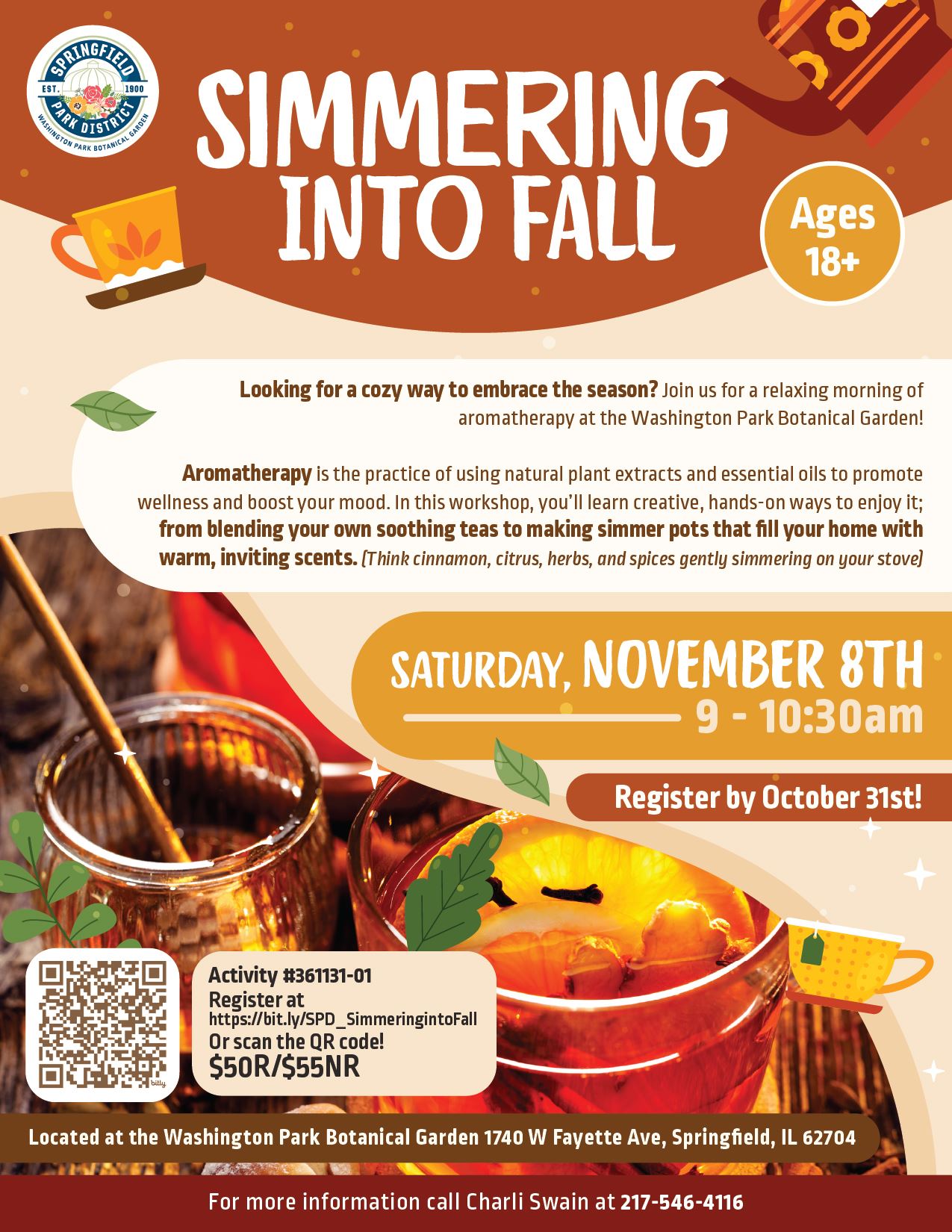 Nov08 Simmering into Fall Looking for a cozy way to embrace the season? Join us for a relaxing morning of aromatherapy at the Washington Park Botanical Garden! Read more about Simmering into Fall on 11/8/2025
