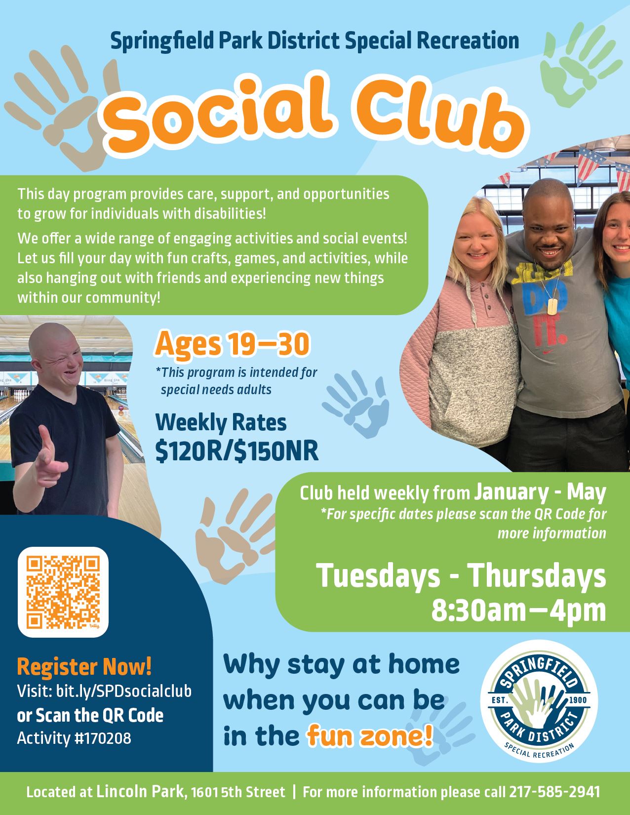 Mar16 Mar 20 Special Recreation's Spring Break Social Club! Need a fun and safe place for your child to attend while on Spring Break? Come out to Springfield Park District Special Recreation's Spring Break Social Club! Read more about Special Recreation's Spring Break Social Club! on 3/16/2026 to 3/20/2026