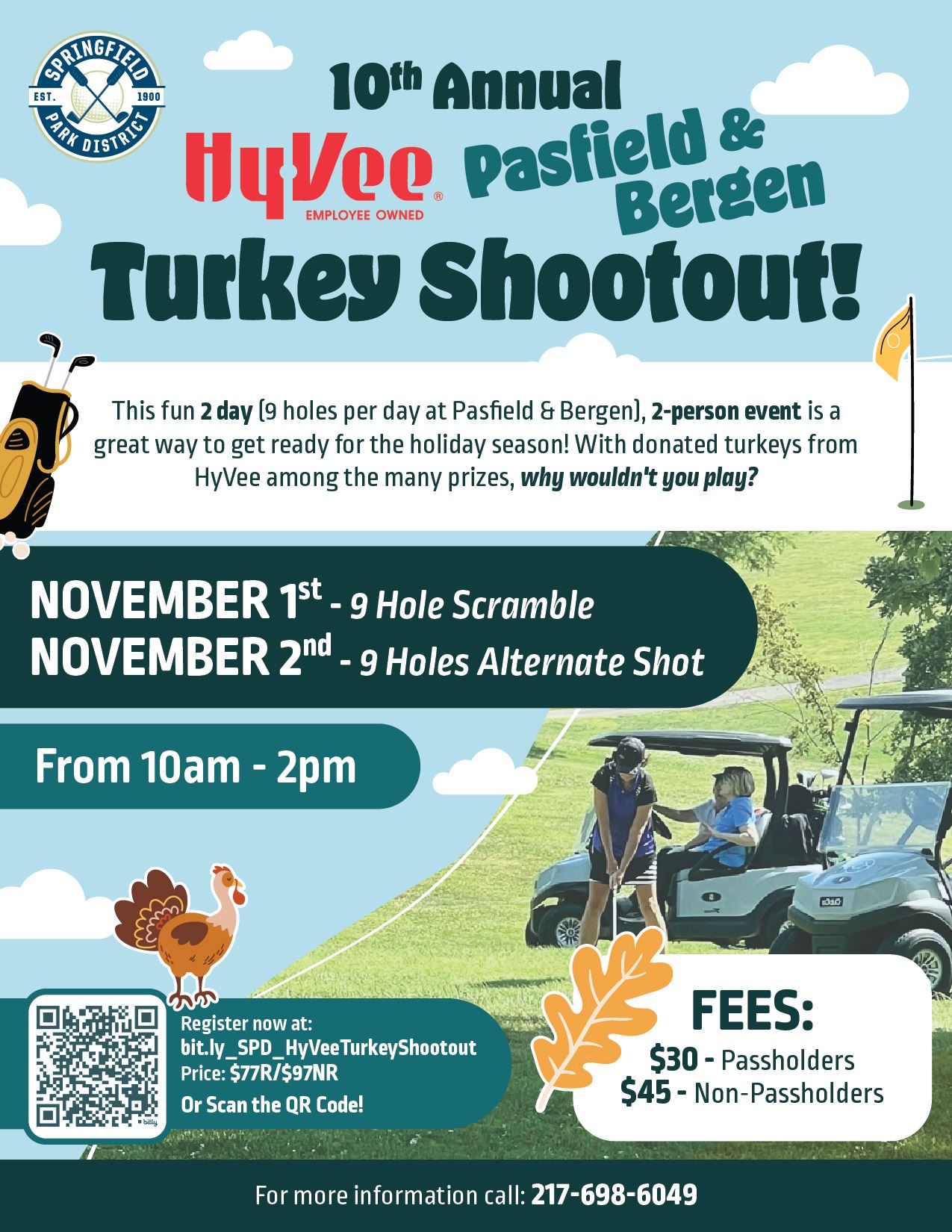 Nov01 Nov 02 10th Annual HyVee Pasfield and Bergen Turkey Shootout! This fun 2 day (9 holes per day at Pasfield & Bergen), 2-person event is a great way to get ready for the holiday season! Read more about 10th Annual HyVee Pasfield and Bergen Turkey Shootout! on 11/1/2025 to 11/2/2025
