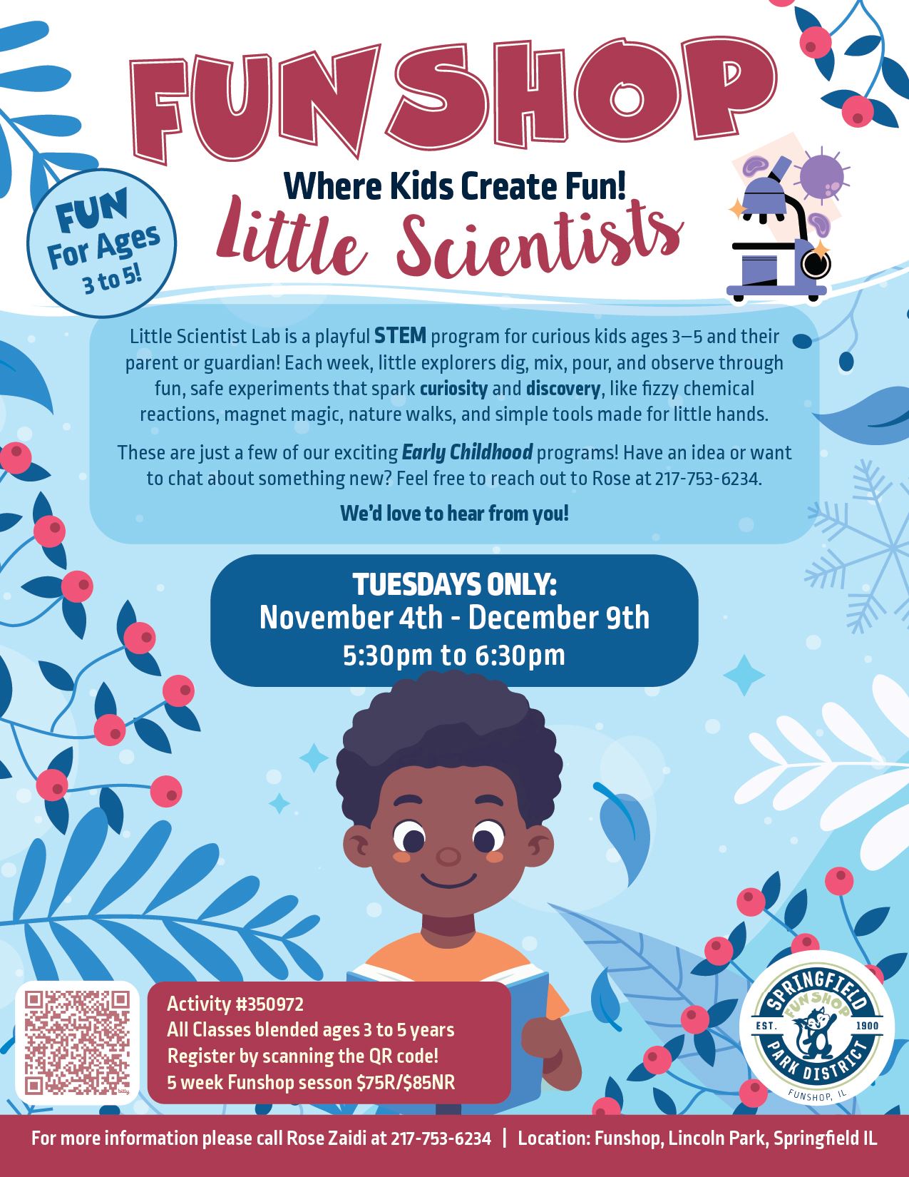 Nov04 Little Scientists Does your child love to dig, mix, pour, and discover? Our Little Scientists Funshop is the perfect playful STEM program for kids ages 3–5 and their grown-ups! Read more about Little Scientists on 11/4/2025