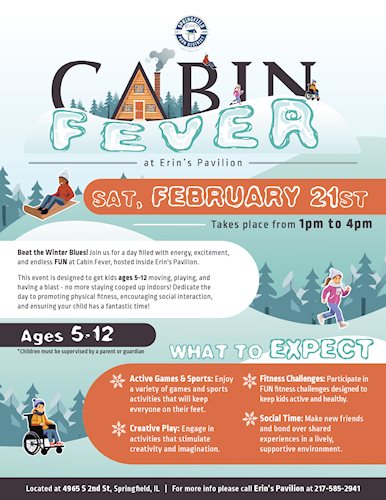 Beat the Winter Blues! Join the Springfield Park District for a day filled with energy, excitement, and endless FUN at Cabin Fever, hosted indoors at Erin's Pavilion.
