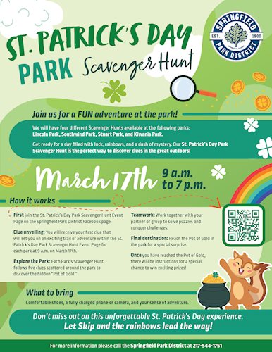 - First join the St. Patrick’s Day Park Scavenger Hunt Event Page on the Springfield Park District Facebook page.