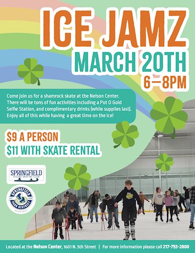 Get ready for a night of fun on the ice at Ice Jamz on March 20 from 6–8 PM at the Nelson Center! Bring your friends and family and celebrate with a festive Shamrock Skate full of music, activities, and great memories.