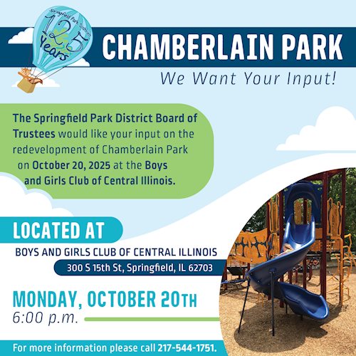 The Springfield Park District Board of Trustees invites you to share your thoughts on the redevelopment of Chamberlain Park.